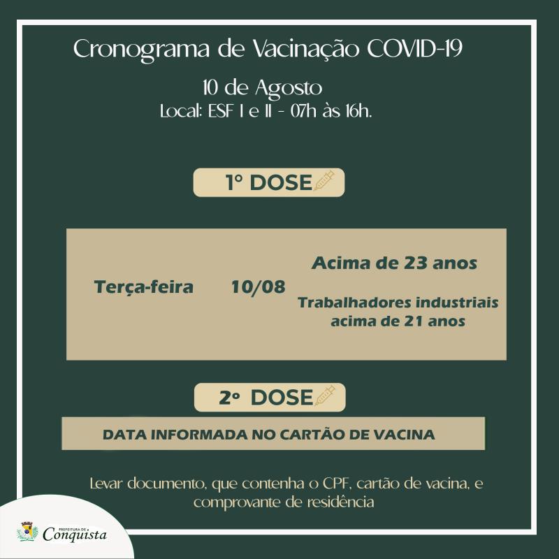 Nesta terça-feira (10/08) serão vacinadas as pessoas acima de 23 anos e trabalhadores industriais acima de 21 anos.