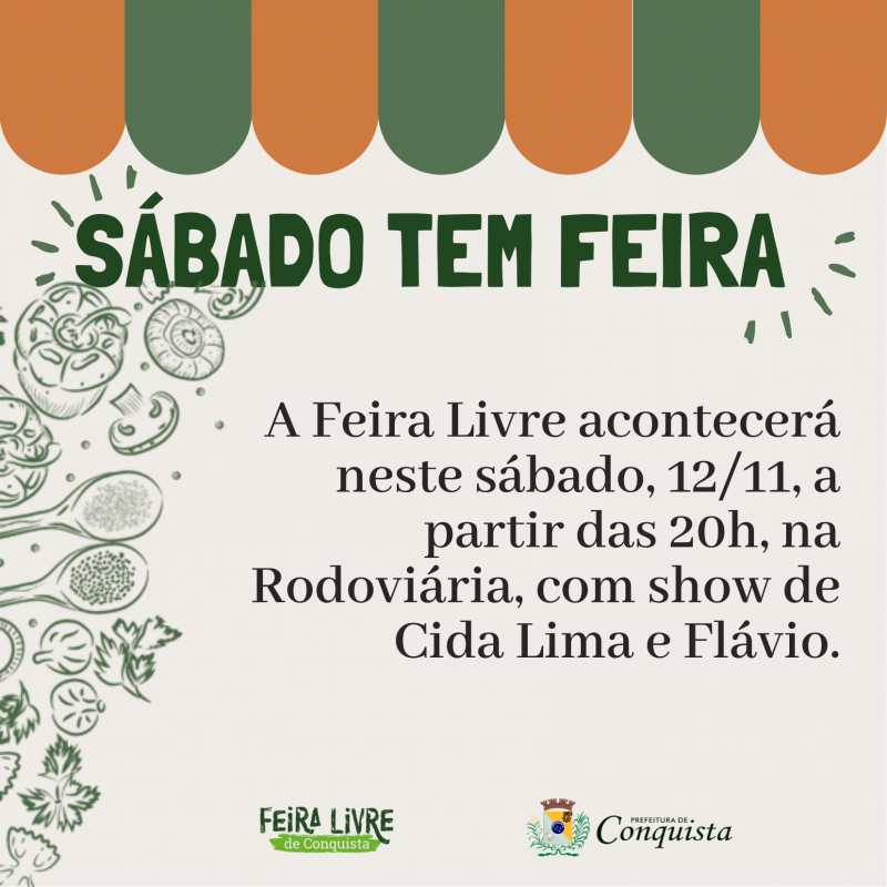 A Prefeitura Municipal, por meio do Departamento de Agricultura, convida a população para participar da Feira Livre, neste sábado (12/11), a partir das 20h, na rodoviária.