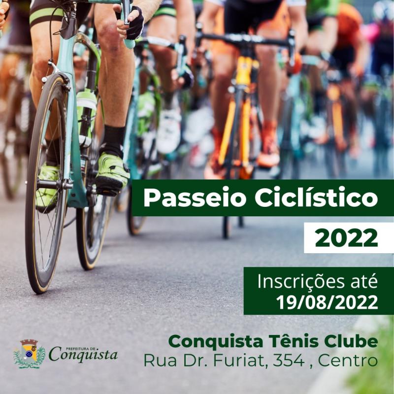 A Prefeitura Municipal, por meio do Departamento de Esporte e Lazer, informa à população que estão abertas as inscrições para o Passeio Ciclístico, em comemoração aos 111 anos de Conquista, que será realizado no dia 28 de Agosto.