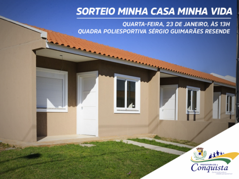 O Conselho Municipal de Habitação informa a todos a lista definitiva dos inscritos aptos a participarem do sorteio do Programa Minha Casa Minha Vida, para os empreendimentos Boa Vista I e Boa Vista II e informa a toda população que o sorteio acontecerá na próxima 4ª feira (23/01) ás 13 horas na quadra poliesportiva Sérgio Guimarães Resende. O evento é aberto ao público e tudo está sendo preparado com muito carinho. Por oportuno a informamos a todos que caso a família sorteada não esteja presente, ela não sera excluída, pois a presença não é obrigatória.