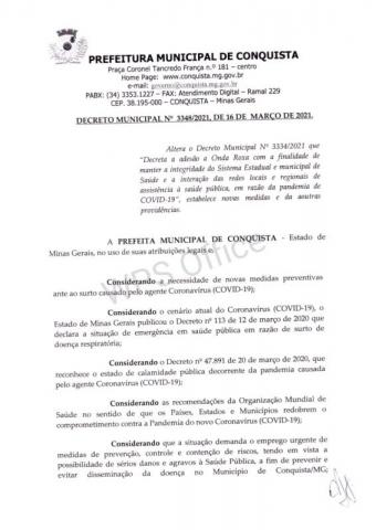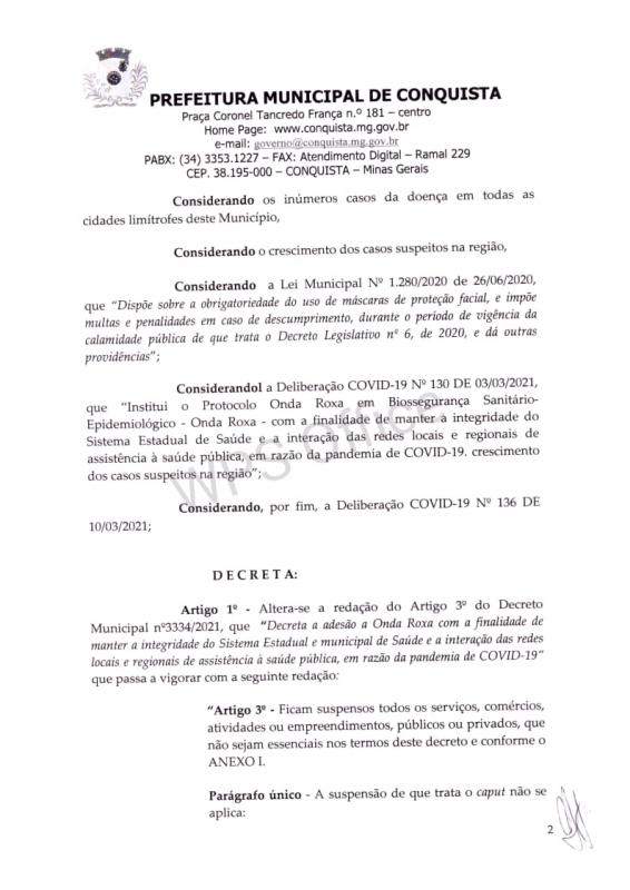Altera o Decreto Municipal Nº 3334/2021 que "Decreta a adesão á Onda Roxa do Plano Minas Consciente, previsto na Deliberação 130 do Comitê Extraordinário do COVID-19 de 03/03/2021, com a finalidade de manter a integridade do Sistema Estadual e Municipal de Saúde e a interação das redes locais e regionais de assistência à saúde pública, em razão da pandemia de COVID-19" estabelece novas medidas e dá outras providências